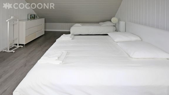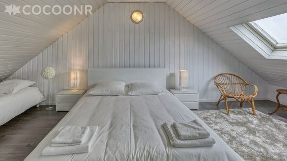 - Une grande chambre mansardée avec un lit queen-size (160x200) et un lit simple d'appoint