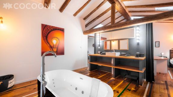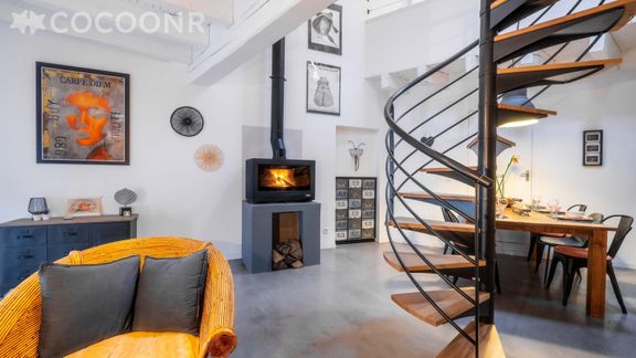 - Une pièce de vie de 65 m² avec TV, cheminée (bois non fourni)