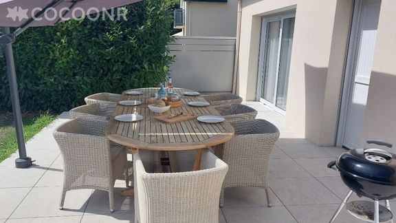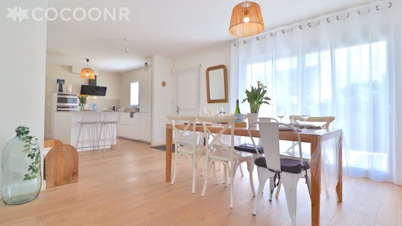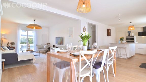 - Grand salon-séjour lumineux avec TV et WIFI, avec accès terrasse et jardin, un espace repas avec une table pouvant accueillir 8 convives.