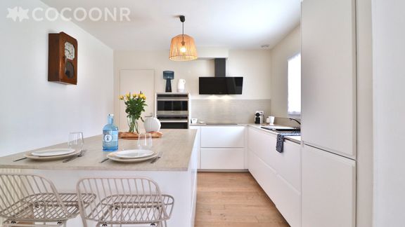 - Cuisine ouverte et équipée (rénovée en 2022) comprenant : lave-vaisselle, plaque à induction, four multifonction, combiné réfrigérateur-congélateur, micro-ondes, bouilloire, cafetière Nespresso et cafetière à filtre, grille-pain, Soda-Stream, vaisselles et ustensiles de cuisine pour 10 personnes... Epicerie de base fournie (sel, poivre, huile, sucre...). Les torchons et essuie-mains sont fournis