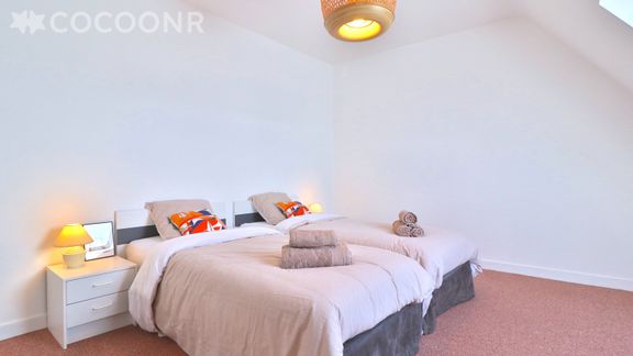 Chambre 2 : deux lits simples 90 x 190 cm (pouvant être rapprochés) et lit bébé en bois