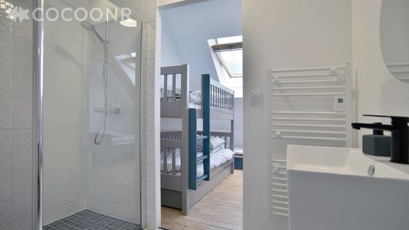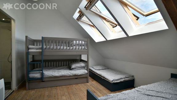 - Chambre 5 : avec 2 lits simples et un lit superposé/gigogne ( 3 couchages ), une salle d'eau d'eau attenante avec douche