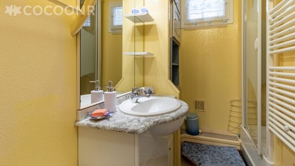 - Une salle d’eau avec douche, une vasque et un sèche-cheveux.