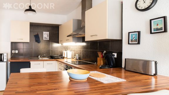 - Une cuisine équipée avec notamment : bouilloire électrique, four, four à micro-ondes, grille-pain, plaques de cuisson...