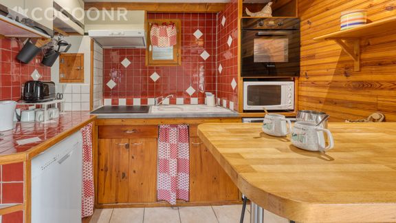 - Une cuisine ouverte et équipée avec notamment : bouilloire électrique, four, four à micro-ondes, grille-pain, lave-vaisselle, plaques de cuisson, lave-vaisselle, etc.