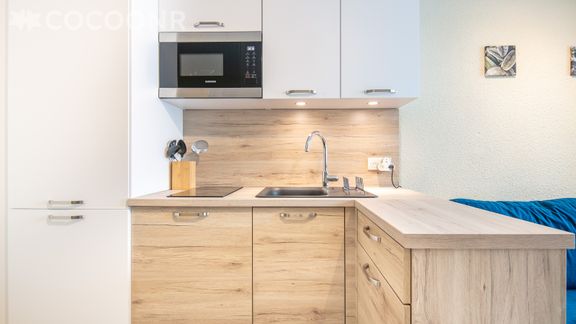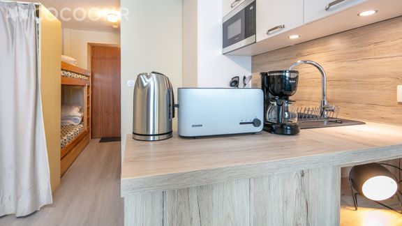 - Une kitchenette équipée avec notamment : bouilloire électrique, four multifonctions, grille-pain, plaques de cuisson, espace repas...