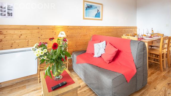 - Une pièce de vie de 16 m² avec TV, canapé-lit double et un coin repas
