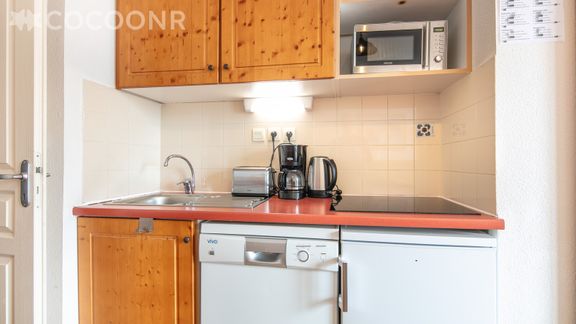 - Une kitchenette équipée avec notamment : bouilloire électrique, four à micro-ondes, grille-pain, lave-vaisselle, plaques de cuisson...
