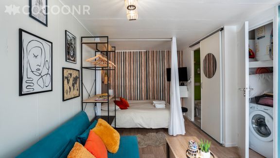 - Un espace chambre séparé par un rideau avec un lit double et un grand placard.