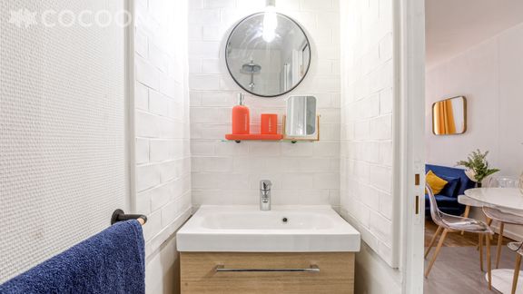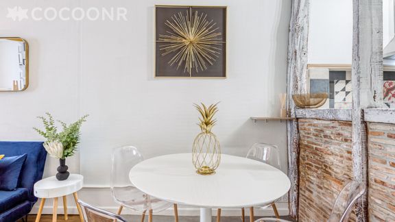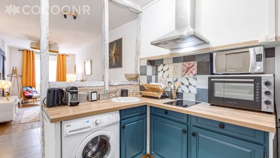 - Une pièce de vie claire et épurée avec un espace salon doté d'un canapé (convertible), table basse, TV et petit bureau, d'un espace repas avec table ronde et d'une jolie cuisine en faïence entièrement équipée (réfrigérateur, four, plaques à induction, micro-ondes, grille-pain, bouilloire, cafetière Nespresso, lave-linge, etc).
