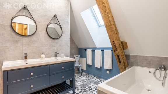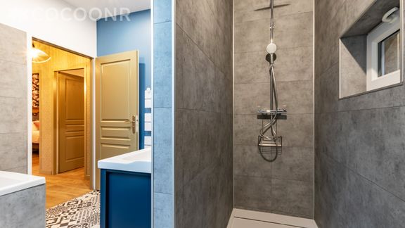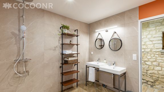- Une salle d'eau de 7.5 m² avec douche, double vasque, radiateur sèche serviette.