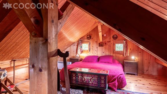 - Chambre 4 sous les toits : 2 lits simples rapprochés pour former un lit double (accessible par échelle de meunier) et petit coin lecture.
