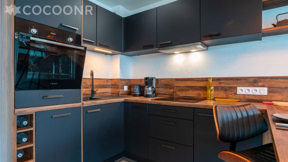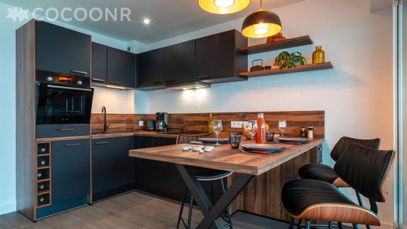 - Une cuisine équipée avec notamment : bouilloire électrique, micro-ondes, machine à café Nespresso, four, grille-pain, lave-vaisselle, plaques de cuisson et coin repas