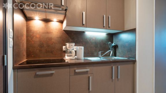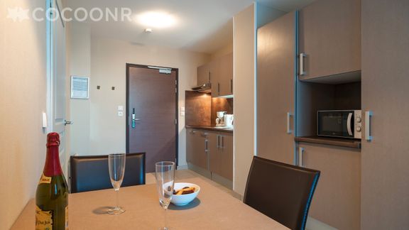 - Une cuisine équipée avec notamment : bouilloire électrique, four à micro-ondes, grille-pain, lave-vaisselle, plaques de cuisson...