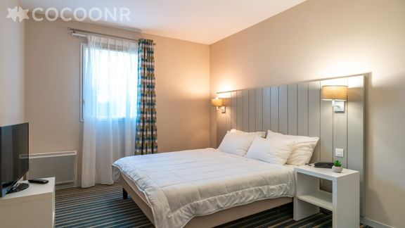 - Une chambre avec un lit queen-size (160×200) et une salle d'eau attenante avec douche, TV
