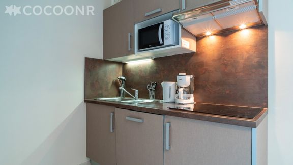- Une cuisine équipée avec notamment : bouilloire électrique, four à micro-ondes, grille-pain, lave-vaisselle, plaques de cuisson...