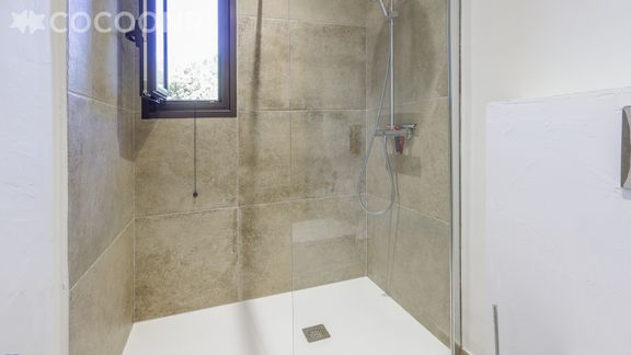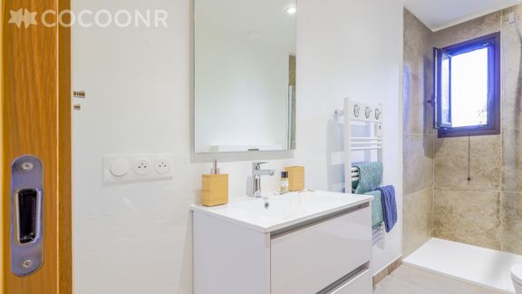 - Une salle d'eau avec douche, sèche-serviettes, WC