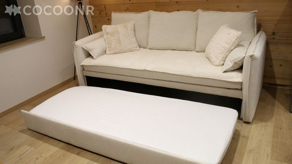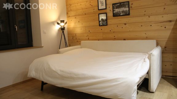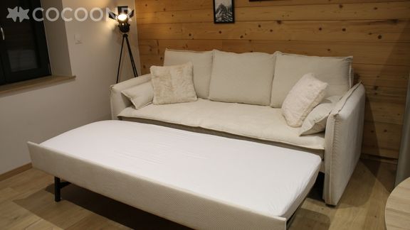 - Une pièce de vie de 25 m² avec TV, canapé-lit avec plusieurs configurations possibles : soit 1 lit double 160x200 soit 2 Lits simples 80x200
