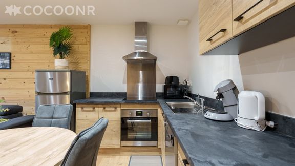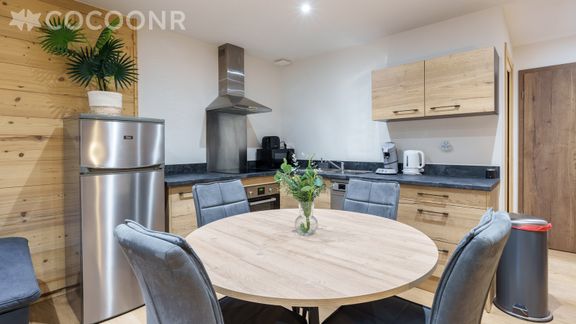 - Une cuisine équipée avec notamment : bouilloire électrique, four, four à micro-ondes, grille-pain, lave-vaisselle, plaques de cuisson...