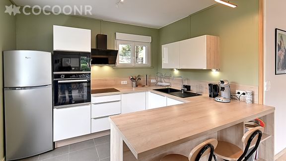 - Une cuisine américaine neuve et équipée avec notamment : bouilloire électrique, four, four à micro-ondes, machine à café Senseo, grille-pain, lave-vaisselle, plaques de cuisson...