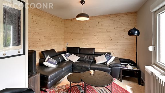 - Une pièce de vie lumineuse de 35 m² avec canapé d'angle, TV, poêle à bois (bois fourni) et espace repas