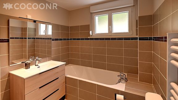 - Une salle de bain avec baignoire, lavabo et WC
