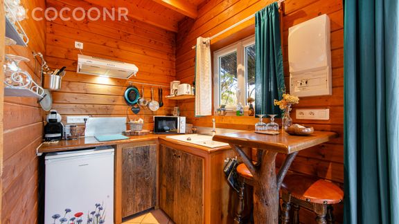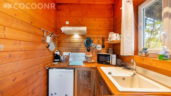 - Une kitchenette équipée avec notamment : four à micro-ondes, grille-pain, plaques de cuisson et coin repas