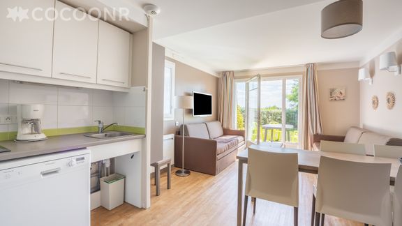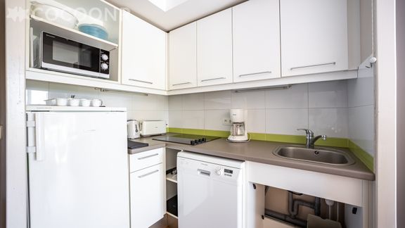 - Une kitchenette ouverte équipée avec notamment : bouilloire électrique, four à micro-ondes, four, grille-pain, lave-vaisselle, plaques de cuisson, machine à café à dosette...