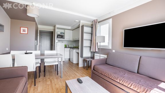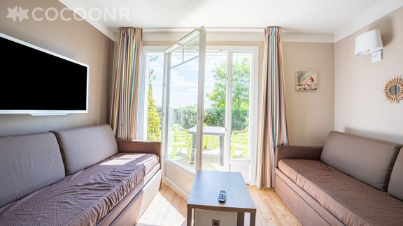 - Une pièce de vie de 22 m² avec TV, canapés et espace repas.