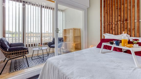 - Chambre 1 : un lit double 160 x 190 cm. Loggia aménagée avec deux fauteuils, vue sur le bocage et les dunes.