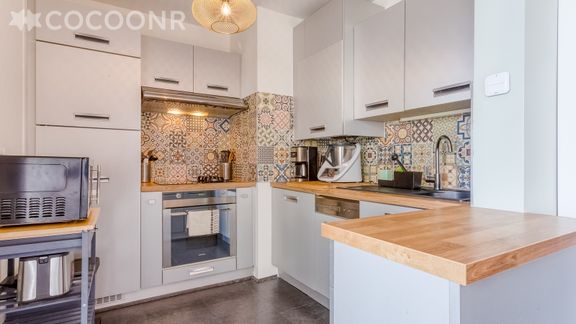 - Une cuisine moderne ouverte sur le salon, entièrement équipée : réfrigérateur, lave-vaisselle, four, plaques, micro-ondes, grille-pain, bouilloire, cafetière à filtre...