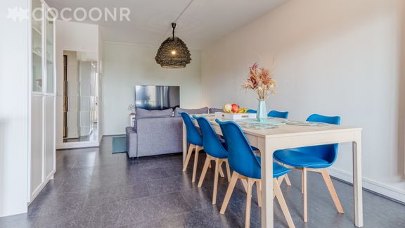 - Une belle pièce de vie lumineuse avec un coin salon doté d'un canapé-lit double, une table basse, une TV ainsi qu'un espace repas avec une table à manger pouvant accueillir jusqu'à 6 convives.
