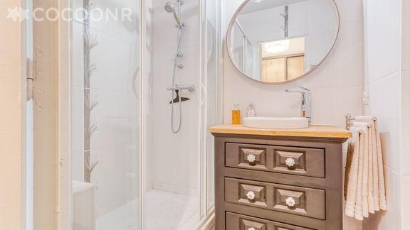 - Salle d'eau avec une douche, une vasque, rangements, un étendoir et un sèche-cheveux.