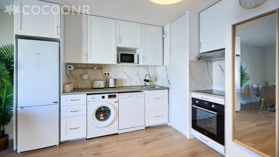 - Une cuisine équipée avec notamment : bouilloire électrique, four, four à micro-ondes, grille-pain, lave-vaisselle, lave-linge, plaques de cuisson...