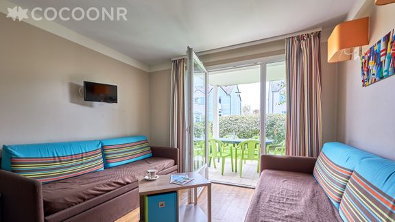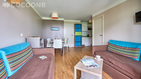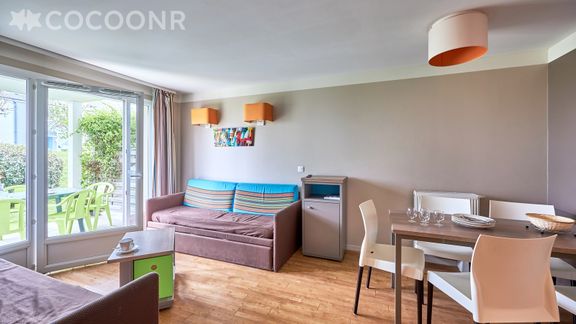 - Une pièce de vie de 15 m² avec deux canapés lit gigogne (90x190), TV et un espace repas.