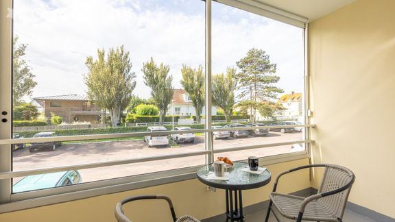 Balkon met tafeltje en 2 stoelen, apart afsluitbaar met glazen wand.