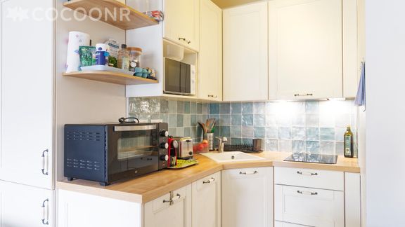 - Une cuisine ouverte équipée avec notamment : bouilloire électrique, four, four à micro-ondes, grille-pain, lave-vaisselle, plaques de cuisson...