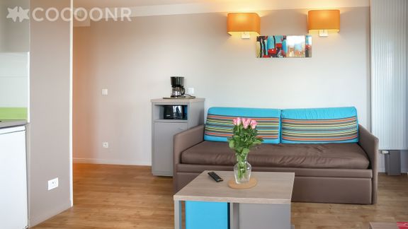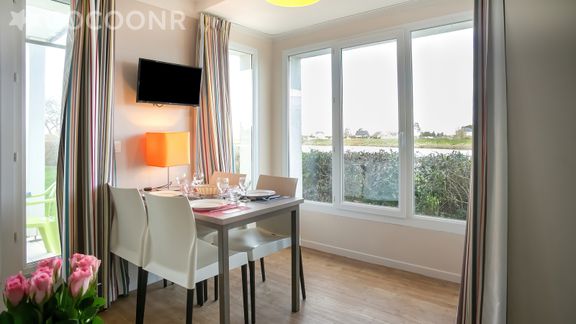 - Une pièce de vie de 12 m² avec TV, canapé-lit double et espace repas.