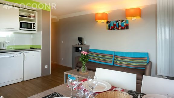 - Une kitchenette ouverte équipée avec notamment : bouilloire électrique, four, four à micro-ondes, grille-pain, lave-vaisselle, plaques de cuisson...