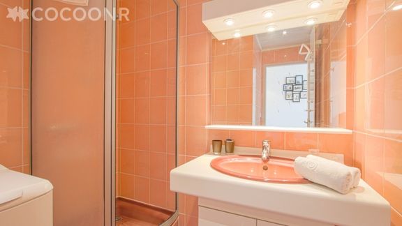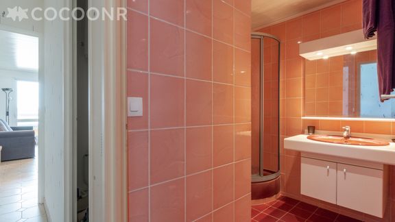 - Une salle d'eau avec une douche, un lavabo et un étendoir