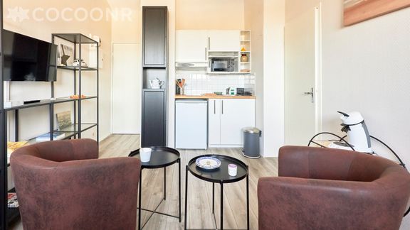 - Une pièce de vie de 19 m² avec deux fauteuils, TV, coin repas