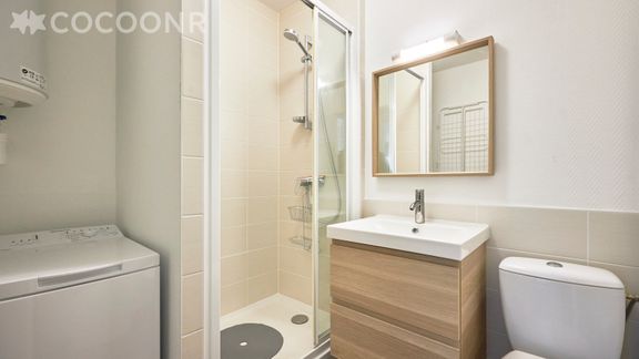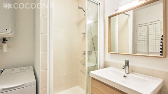 - Une salle d'eau avec douche, meuble vasque, machine à laver, WC