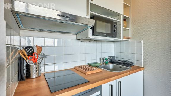 - Une cuisine ouverte équipée avec notamment : bouilloire électrique, four, four à micro-ondes, grille-pain, plaques de cuisson...
