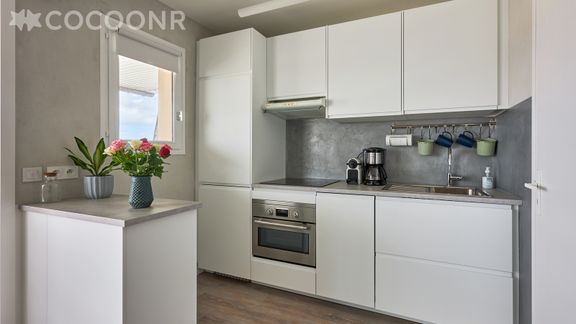 🙂 This apartment is modern, spacious, airy and clean! A good space for two people. The decor is lovely, and they have invested in a dishwasher, washing machine and electronic blinds. The kitchen is well stocked with utensils and dishes. The deck is big enough for two people and we were able to use it every night. A reminder that it is not air conditioned. We kept the windows and blinds closed on the hot days, and then opened up in the evening.