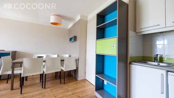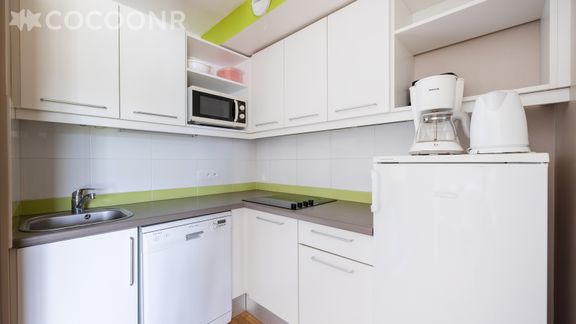 - Une cuisine ouverte équipée avec notamment : bouilloire électrique, four à micro-ondes, grille-pain, lave-vaisselle, plaques de cuisson, machine à café à filtre...
