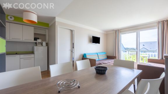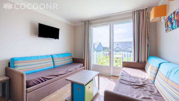 - Une pièce de vie de 21 m² avec TV, canapés (dont 1 convertible) et espace repas.