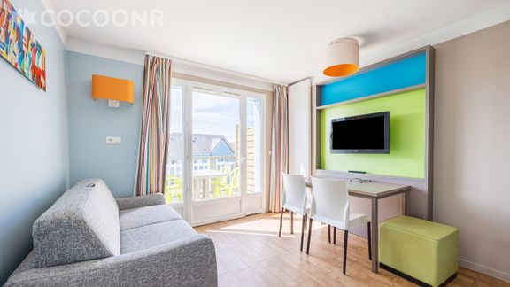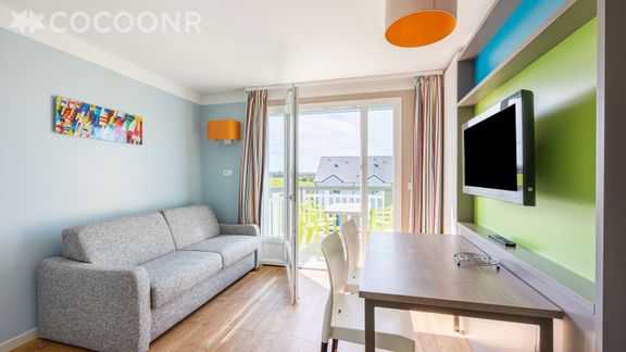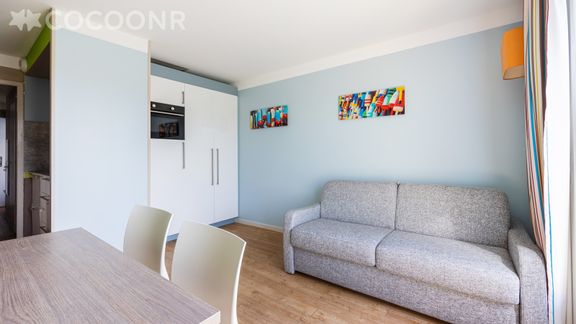 - Une pièce de vie ensoleillée de 18 m² avec TV, canapé convertible (double) et coin repas.