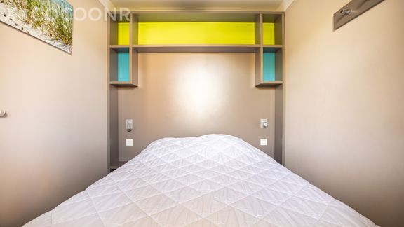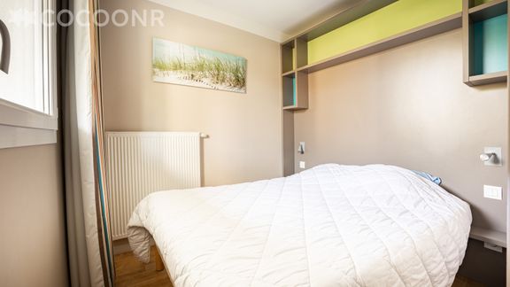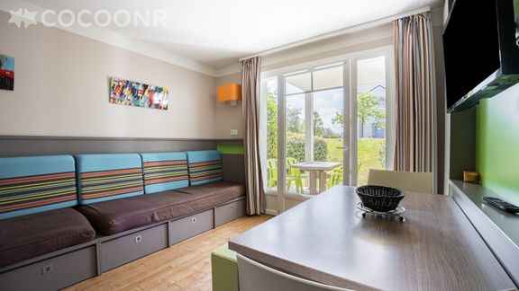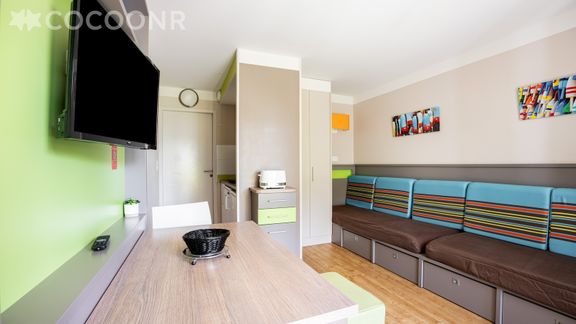 - Une pièce de vie de 15 m² avec TV, canapé non convertible (banquette pouvant servir de deux couchages à la file) et espace repas.