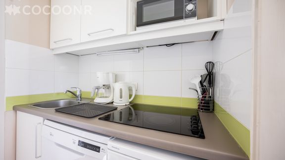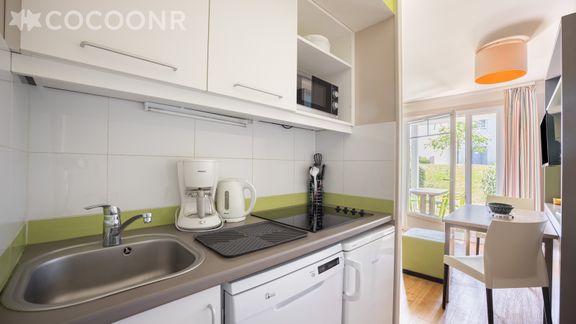 - Une kitchenette équipée avec notamment : bouilloire électrique, four, four à micro-ondes, grille-pain, lave-vaisselle, plaques de cuisson, machine à café à filtre...