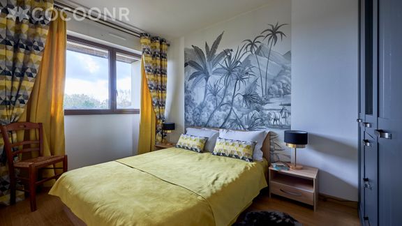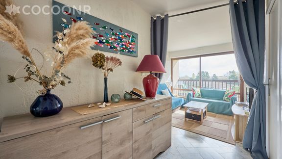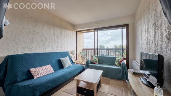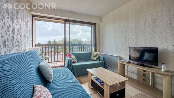 - Une pièce de vie de 27 m² avec un canapé, un clic-clac double, table basse, accès balcon, TV...